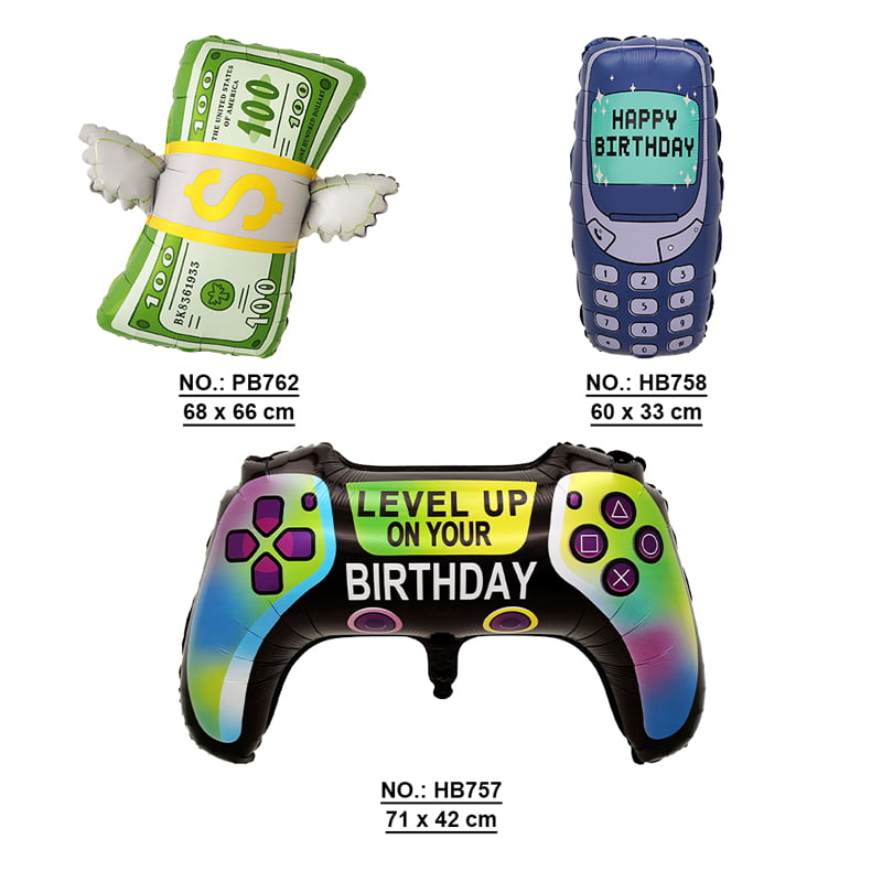 Helium / AirUnique & Fun Designs – Features a variety of birthday-themed balloons including a game controller, retro mobile phone, and money roll design, perfect for different party themes.