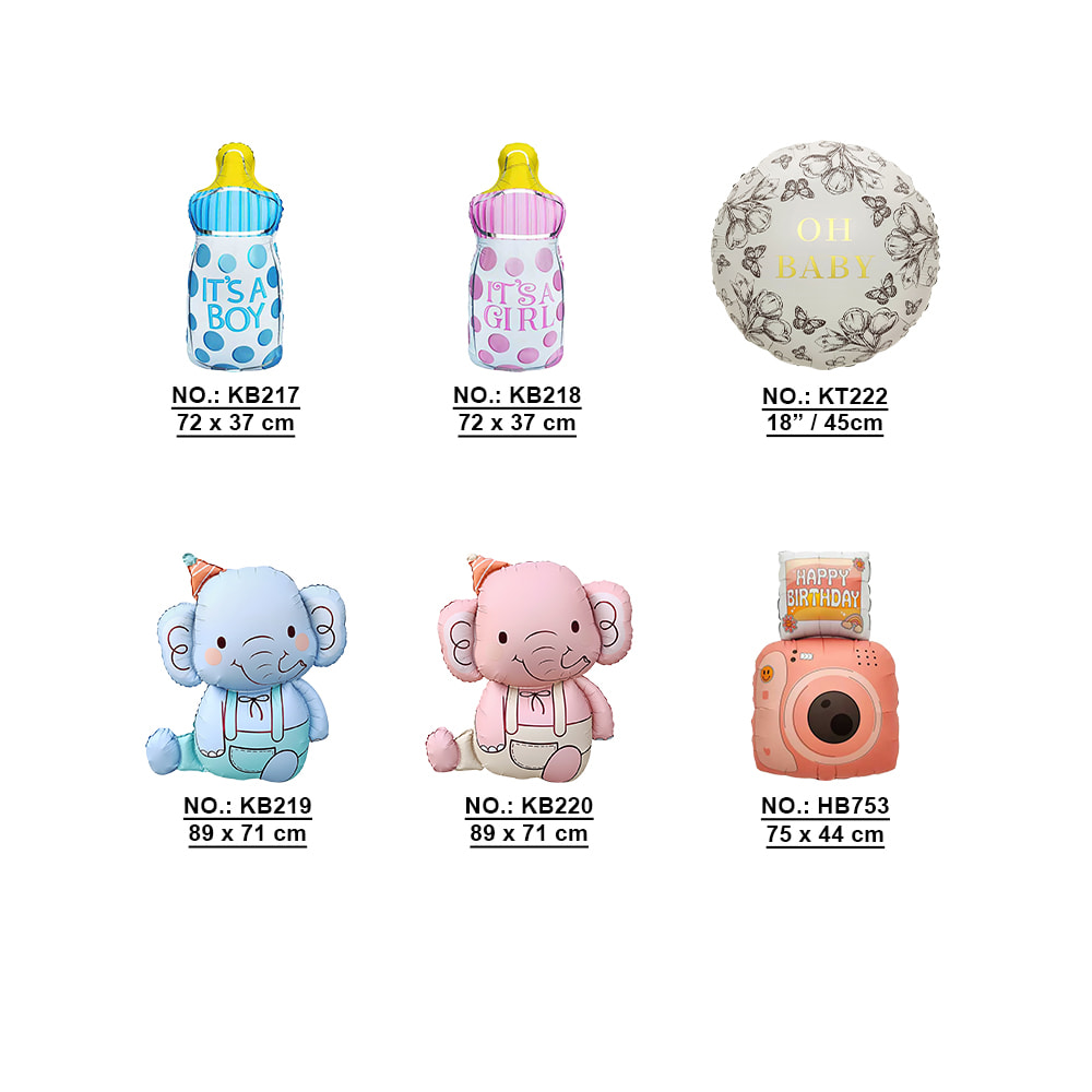 Variety of Styles – Milk bottle balloons with “It’s a Boy / It’s a Girl” text, classic “Oh Baby” round balloon, cute blue & pink elephants, and a camera-shaped birthday balloon.